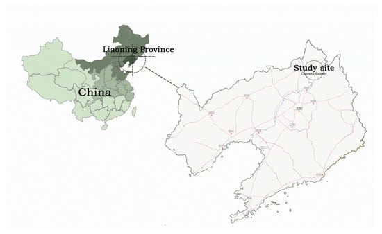 The study site was established at the Liaohe Plain Forest Ecological Station of the State Forestry and Grassland Administration (Fujia Machinery Forest Farm, Changtu County, Tieling City, Liaoning Province) (43°21′143″–42°53′623″ N, 123°53′623″–123°53′623″ E), which is located on the southeastern edge of Horqin Sandy Land, where three provinces, Liaoning, Jilin and Inner Mongolia meet. The landform consists of the Liaohe alluvial plain type, with an elevation of 91.10–173.40 m. It has a temperate semihumid and semiarid continental climate with an average annual precipitation level of 400–550 mm, which is mostly concentrated in July and August each year, with annual evaporation of 1843 mm, extreme maximum temperature of 35.6 °C, extreme minimum temperature of −31.5 °C, and daily average temperature of 6.3 °C. The soil type is yermic with low contents of organic matter and other nutrients. The main vegetation community in this area consists of a windbreak and sand-fixation forest with P. sylvestris var. mongolica as the main component, with a planting area of 54.86 km2 and canopy closure of 0.7. The terrain is flat, and the understory contains a few shrubs and herbs (Figure 1).