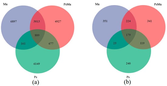 Venn diagram showing unique and shared OTUs of leaf litter microbial for three different samples. (a): Unique and shared OTUs of leaf litter bacteria in three different samples; (b): Unique and shared OTUs of leaf litter fungal in three different samples. Ma: Morus alba; PsMa: Pinus sylvestris var. mongolica × Morus alba; Ps: Pinus sylvestris var. mongolica.