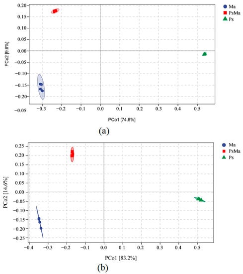 Principle coordinate analysis (PCoA) of Bray–Curtis’s distance from all samples. (a): PCoA of bacterial communities in different samples; (b): PCoA of fungal communities in different samples. Ma: Morus alba; PsMa: Pinus sylvestris var. mongolica × Morus alba; Ps: Pinus sylvestris var. mongolica. The circle in the figure is the 95% confidence ellipse.