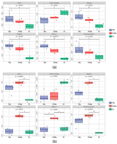 Alpha diversity index analysis was performed on samples with different leaf litter ratios, and boxplots were drawn. The litter bacterial diversity indices, including the Chao1 index (p = 0.015), Pielou_e index (p = 0.0073), Goods_coverage (p = 0.015), Shannon index (p = 0.012), Simpson index (p = 0.018) and Observed_species (p = 0.018), showed significant differences among Ma, PsMa and Ps. Ma had the highest Chao1 index, Pielou_e index, Shannon index, Simpson index and Observed_species, which were 5209.033, 0.843, 10.204, 0.996 and 4439.675, respectively, followed by PsMa, while Ps had the lowest. Ma had the highest abundance, diversity and evenness (Figure 4a). However, the fungal results were different from that obtained with bacteria. Litter bacterial diversity index, including Chao1 index (p = 0.0097), Pielou_e index (p = 0.024), Shannon index (p = 0.015), Simpson index (p = 0.023) and Observed_species (p = 0.0073), exhibited significant differences among Ma, PsMa and Ps. Ps had the highest Chao1 index, Pielou_e index, Shannon index, Simpson index and Observed_species, which were 493.582, 0.608, 5.430, 0.941 and 488.7, respectively, were followed by Ma, and Ps had the lowest. The Goods_coverage index showed the opposite pattern, namely, Ps > PsMa > Ma. PsMa exhibited the highest abundance, diversity and evenness (Figure 4b).