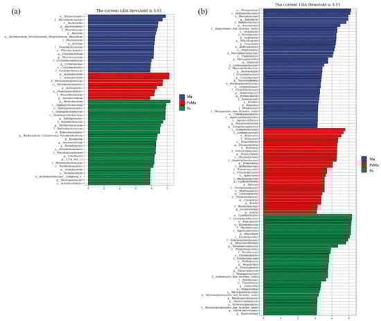 Microbial community of different leaf litter ratios with significantly different taxa. (a): litter bacterial communities; (b): litter fungal communities. Ma: Morus alba; PsMa: Pinus sylvestris var. mongolica × Morus alba; Ps: Pinus sylvestris var. mongolica. In the significantly changed bacterial taxon under different litter types, the ordinate is a taxonomic unit with significant differences between groups, and the abscissa visualizes the logarithmic scores of the LDA difference analysis corresponding to the taxon and sorts them according to the size of the scores to describe them as different. The size of the difference in the grouped sample. The longer the length, the more significant the difference between the taxon units, and the different color of the bar chart indicates the higher abundance sample group corresponding to the taxon.