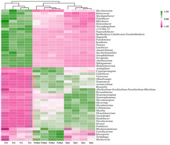 Heatmap and cluster analysis based on relative abundance of the top 50 genera identified in litter bacterial communities. The samples are grouped according to their similarity to each other. In the figure, pink represents the genus with lower abundance in the corresponding sample, green represents the genus with higher abundance, and the color change represents the level of abundance. Ma: Morus alba; PsMa: Pinus sylvestris var. mongolica × Morus alba; Ps: Pinus sylvestris var. mongolica.