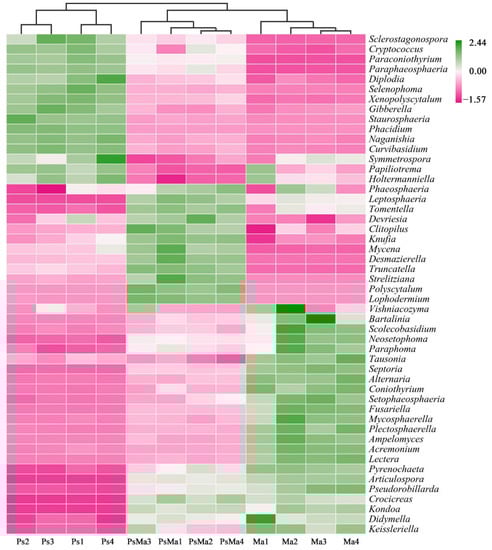 Heatmap and cluster analysis based on relative abundance of the top 50 genera identified in litter fungal communities. The samples are grouped according to their similarity to each other. In the figure, pink represents the genus with lower abundance in the corresponding sample, green represents the genus with higher abundance, and the color change represents the level of abundance. Ma: Morus alba; PsMa: Pinus sylvestris var. mongolica × Morus alba; Ps: Pinus sylvestris var. mongolica.