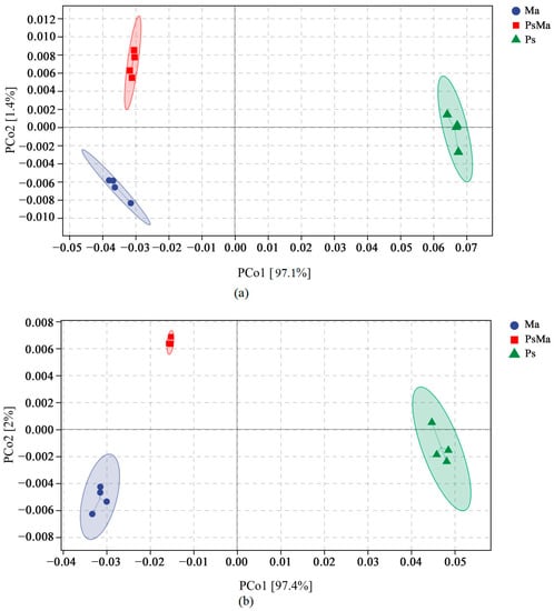 The sample difference distance matrix (Bray–Curtis’s distance is used by default) was combined with principal coordinate analysis to expand the sample functional differences in two dimensions and provided the principal coordinate analysis map of the microbial functional units of the different litter types. As shown in Figure 9a, the first two axes of functional units of the different litter bacterial communities accounted for 98.5% of the total variance (e.g., PCo1 97.1% and PCo2 1.4%). The first two axes of the fungal communities accounted for 99.4% (e.g., PCo1 97.4% and PCo2 2%). For the bacterial and fungal communities, Ma, PsMa, and Ps were clearly separated along the PCo1 axis. Ma and PsMa were located on the negative semiaxis of PCo1, and Ps was located on the positive semiaxis (Figure 9b).