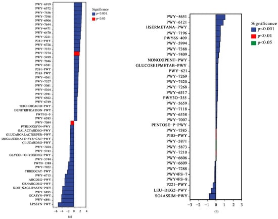 After obtaining the abundance data of the metabolic pathways, we used Ps as the control group and PsMa as the upregulated group and attempted to determine the metabolic pathways with significant differences among the groups. As shown in Figure 11a, in the bacterial communities, except for PWY-7274 and PWY-7084 (p < 0.05), the rest of the metabolic pathways were significantly different in different leaf litters (p < 0.001). Among the fungal communities of different litter leaves, PWY-7210, PWY-7385, and P185-PWY were not significant (p < 0.01). PWY-6606, PWY-5873 and PWY-5871 had significant differences (p < 0.05), and the rest had extremely significant differences (p < 0.001) (Figure 11b).