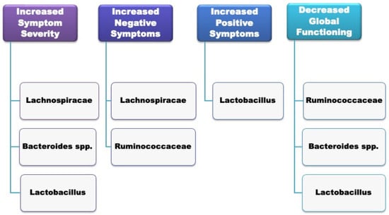 Gut microbial composition has been associated with the severity of psychotic symptoms and a poorer global functioning among patients with first-episode psychosis of any psychiatric cause at the time of hospitalisation [62]. In particular, Lachnospiraceae, Bacteroides spp. and Lactobacillus significantly correlated with increased symptom severity; negative symptoms correlated with Lachnospiraceae and Ruminococcaceae spps.; increased positive symptoms were associated with Lactobacillus; and decreased global functioning correlated with Ruminococcaceae, Bacteroides and spp. Lactobacillus. A summary of the specific microbiome alterations associated with the clinical features of FEP can be seen in Figure 1.