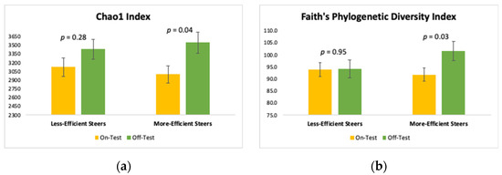 Microbial richness (expressed as Chao1 index), and microbial diversity (expressed as Faith’s phylogenetic diversity index) are shown in Figure 1. Chao1 index significantly increased during the course of the feedlot in the most efficient steers (p = 0.04), but not in the less efficient steers (p = 0.28). Likewise, Faith’s phylogenetic diversity index was increased in the feces of the more efficient steers (p = 0.03), but not in the less efficient ones (p = 0.95).