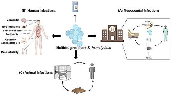 There are several clinical manifestations recorded with S. haemolyticus infections such as bloodstream infections, ocular infections, epididymo-orchitis, chronic prostatitis, UTI, etc. Furthermore, it is an important pathogen associated with hospital-acquired infections (Figure 1). Other complications were also recorded especially in immunocompromised patients such as septicemia, peritonitis, and otitis [12,13].