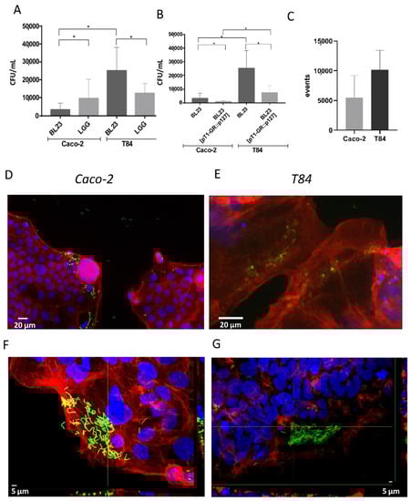 Different techniques used to determine spontaneous internalization of lactobacilli. (A) Internalization of BL23 and LGG in Caco-2 and T84 determined by the gentamicin protection method, and data represent means of CFU per mL specific assays and controls from other assays (a total of 64 experiments, with three replicates per assay, a total of 192 determinations), bars indicate standard deviations. (B) Assay showing differences in the internalization efficiency between BL23 and the recombinant strain carrying plasmid pT1-GR::p127 used in microscopic observations, as it allowed the expression of fluorescent proteins GFP and RFP (results from four separate assays, with three internal replicates per condition). (C) Internalization of BL23 [pT1-GR::p127] determined by flow cytometry in Caco-2 and T84; graph represents the means and standard deviation of red fluorescent events in two different assays with at least three determinations. Differences between groups compared with Tamhane’s test. * p < 0.001. (D,E) Epifluorescence photographs showing internalization of BL23 [pT1-GR::p127] by (D) Caco-2 and (E) T84 cells. White scale bars represent 20 µm. (F,G) confocal microscopy photographs showing internalization of BL 23 [pT1-GR::p127] by (F) Caco-2 and (G) T84 epithelial cells; orthogonal projections are shown at the bottom and right hand side of each photograph. White scale bars represent 5 µm.
