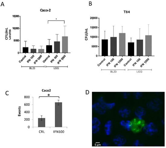 Gentamicin assays used to determine internalization of BL23 and LGG after the treatment of epithelial cells with 100 and 1000 UI/mL IFN-γ. (A) Internalization using Caco-2 and (B) T84 cells. Data shown are means of internalized bacteria per mL with standard deviation in all experiments (results from four separate assays, with three internal replicates per condition). (C) Effect of 100 UI/mL IFN-γ on the internalization of BL23 [pT1-GR-p127] determined by flow cytometry; graph represents the means and standard deviation of red fluorescent events in two different assays with at least three determinations. (D) Selected epifluorescence microscope image of Caco-2 cells incubated with GFP-expressing L. paracasei BL23 [pT1-GR::p127] after the treatment with 1000 U/mL IFN-γ. The white scale bar represents 5 µm. Differences between groups compared with Tamhane’s test. * p < 0.001.