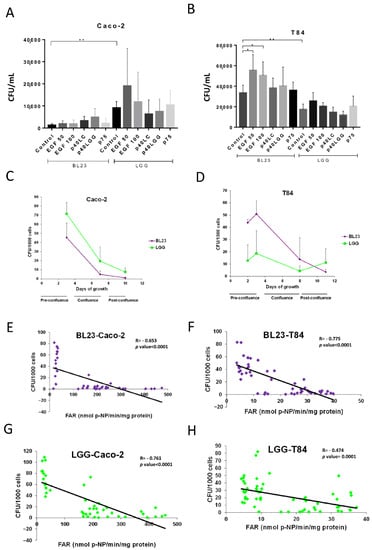 Both strains followed an identical pattern. As shown before, the internalization efficiency of LGG was significantly greater than the BL23 in Caco-2 (p-value = 0.001) (Figure 1A and Figure 3C). The LGG showed a constant uptake profile by the T84 (Figure 3D). In this cell line, the internalization frequency of the BL23 was much greater at an early growth stage and it decreased with confluence as occurred in the Caco-2 (Figure 3C). These data suggest that bacterial entry, especially BL23, depends on a state of active growth of the IECs. In order to determine if these internalization differences were also bound to the differentiation process of epithelial cells, relative FAR activity was determined []. Regression analysis showed that internalization had a significant inverse correlation with cell differentiation (Pearson’s correlation, p-value ≤ 0.0001) (Figure 3E–H). Despite that, these assays showed that undifferentiated, actively growing epithelial cells displayed optimal internalization. The following experiments used IEC at confluence with the aim of achieving conditions comparable to the previous assays.