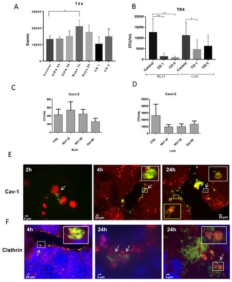 Some works have described the spontaneous endocytosis of commensal and beneficial bacteria and the process involved generally required initial binding steps. Some probiotic lactobacilli have pili-like structures [,,,] or specialized surface proteins (slpA) [,] that efficiently bind to epithelial extracellular matrix proteins. Fibronectin-binding protein (FnbA) from Weissella cibaria inhibited S. aureus adhesion to mammary epithelial cells [], and in fact different reports indicate that Lactobacillaceae can compete and inhibit the internalization of pathogens [,,,]. Other studies reported spontaneous, internalization of lactobacilli by epithelial cells [,,], and genetic engineering works focused on the expression of surface pathogens’ adhesion proteins or single chain antibodies in Lactococcus lactis, Lactiplantibacillus plantarum and Lacticaseibacillus paracasei, to promote attachment and internalization by IEC in vitro and in vivo [,,,,,], hence achieving efficient bacto-transfection [,,,,,]. Nevertheless, the steps following adhesion, optimal epithelial cells status and the mechanisms required for lactobacillus internalization are as yet unknown. In contrast, the internalization of non-invasive E.coli has been well documented and it was bound to caveolin-mediated endocytosis and myosin light chain (MLC) phosphorylation in the terminal network (TW) region leading to brush border fanning (BB) in enterocytes, and this process was stimulated by IFN-γ []. Possibly, as occurred with pathogens and commensal E. coli, the internalization by the IEC of beneficial bacteria would require an inflammatory state and could also occur through endocytic pathways associated with lipid rafts and caveolin-1 [,].