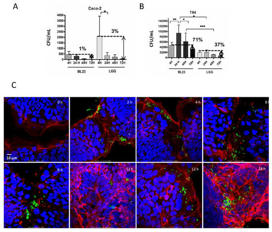 Bacterial strains L. paracasei BL23 (BL23) and L. rhamnosus GG (LGG) were regularly grown on MRS medium (BD™ Difco™ Lactobacilli MRS Broth; Thermo Fisher Scientific, Waltham, WA, USA) under static conditions at 37 °C for 24 h. For counting isolated colonies on petri dishes, MRS with 1.5% agar was used. The strain L. paracasei BL23 [pT1GRPC37] was expressing the red fluorescent (RFP) and green fluorescent (GFP) proteins [], and it was used in the fluorescence/confocal microscopy and flow cytometry assays, as appropriate. This strain required selective pressure of 5 µg/mL of erythromycin (Erm5) in MRS and then it was grown under the same conditions. For the internalization assays described below, BL23 [pT1GRPC37], BL23 and LGG were inoculated in 10 mL MRS (with Erm5 for L. paracasei [pT1GRPC37]), and incubated at 37 °C for 24 h. Optical density of the cultures was measured at 550 nm (OD550) and, according to the calculated growth curve of these strains, the number of bacteria present (CFU/mL) was determined. The culture was centrifuged at 4000 rpm for 10 min, washed with sterile PBS and the pellet was diluted in medium supplemented for Caco-2 (ATCC HTB-37) or T84 (ATCC CCL-248) without antibiotics, with the appropriate dilution to obtain a multiplicity of infection (MOI) of 103 bacteria/cell.