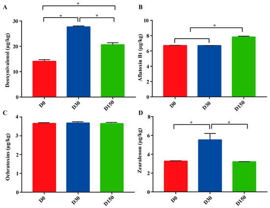 Figure 1. Mycotoxins across the three storage times (n = 6). (A) Deoxynivalenol. (B) Aflatoxin B1. (C) Ochratoxins A. (D) Zearalenone. D0, storage for 0 d; D30, storage for 30 d; D150, storage for 150 d. * Indicates significant difference among the three groups at p < 0.05 level.