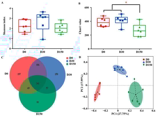 Figure 2. Fungal diversity across the three storage times (n = 6). (A) Fungal diversity was estimated by the Shannon index. (B) Fungal richness is estimated by the Chao1 value. (C) Venn diagram representing the common and unique OTUs found at each storage time point from the three groups. (D) Principal coordinate analysis (PCoA) of samples was conducted based on weighted UniFrac distance from the three groups. D0, storage for 0 d; D30, storage for 30 d; D150, storage for 150 d. * Indicates significant difference among the three groups at p < 0.05 level.