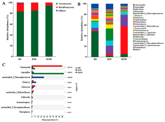 Figure 3. Fungal community structure across the three storage times (n = 6). (A) Phylum-level compositions of the fungal community in the three storage times. (B) Genus-level compositions of the fungal community in the three storage times. (C) The extended error bar plot displaying the significant differences among storage periods at the genus level. D0, storage at 0 d; D30, storage 30 d; D150, storage 150 d.