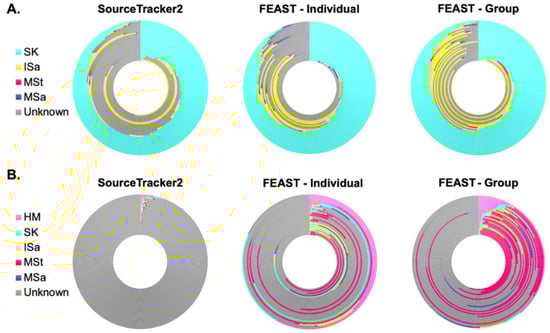 - Shenhav, L.; Thompson, M.; Joseph, T.A.; Briscoe, L.; Furman, O.; Bogumil, D.; Mizrahi, I.; Pe’er, I.; Halperin, E. FEAST: Fast expectation-maximization for microbial source tracking. Nat. Methods 2019, 16, 627–632. [Google Scholar] [CrossRef] [PubMed]