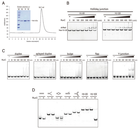Figure 1. Protein purification and substrate specificities of DrRuvC. (A) Size exclusion chromatogram (Superdex 75 10/300 GL column) of recombinant DrRuvC protein. SDS-PAGE of representative eluted fractions is shown in inset. (B) Bandshift analysis of Holliday junctions (HJ-0X and HJ-12X). (C) Bandshift analysis of the indicated DNA structures. From left to right, the binding reactions contained 0, 50, 100, 200, 300, 400, 500 nM of DrRuvC protein. (D) Native PAGE analysis of DrRuvC cleavage of the indicated DNA structures.
