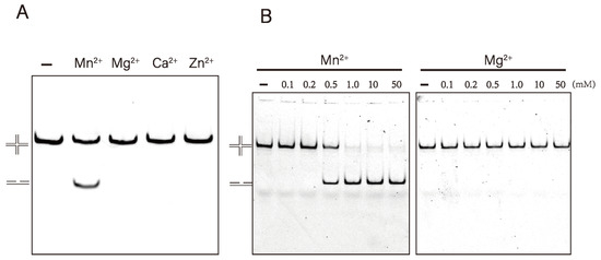 Resolvase usually prefers Mg2+ as a co-factor for catalytic reactions, however, Mn2+ can act as a substitute [19,36,37,38]. To study the metal ion dependence of DrRuvC, we used an HJ-12X substrate with a 12 bp homology region to react under different metal ion conditions. To create a contrast, 10 mM EDTA was included in the reaction buffer to sequester divalent metal ions. Interestingly, Mn2+ rather than Mg2+ is the only catalytic co-factor of DrRuvC resolvase. DrRuvC cleaved HJ-12X efficiently in the presence of Mn2+. However, no activity was detected in the presence of Ca2+, Zn2+, or Mg2+ (Figure 2A). Concentration-dependent experiments showed that no activity was detected with Mg2+ even up to 50 mM (Figure 2B). On the contrary, the DNA substrate was completely cleaved with Mn2+ at a concentration of 1 mM. We also found that 50 mM Mn2+ did not display any inhibitory effect on the activity of DrRuvC (Supplementary Figure S5), although studies have shown that high concentrations (>50 mM) of metal ions can inhibit the resolvase activity of other RuvC [10,37]. Since Mn2+ can enhance the digestion ability of DrRuvC, we tried to perform HJ-0X cleavage assay in the presenc of Mn2+. Unfortunately, even a high concentration of Mn2+ cannot catalyze DrRuvC to cleavage HJ-0X (Supplementary Figure S4), suggesting that the homologous core is strictly needed in the enzyme digestion reaction.
