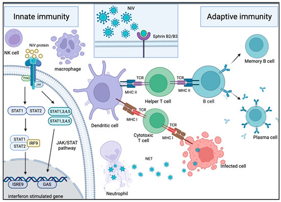 Mechanism of host immune response in NiV infection. Innate immune response upon NiV infection: Neutrophils are one of the first immune cells to be recruited to the site of infection. These cells use NET and antiviral molecules to contain the virus in web-like traps. To counteract this, some NiV proteins are capable of inhibiting the IFN response by interacting with the JAK/STAT pathway. Adaptive immune response upon NiV infection: Following NiV entry via ephrin-B2 or -B3 receptors on the host cellular membrane, it is engulfed and broken down into viral peptides by APC such as macrophages and dendritic cells. The presentation of the viral peptides on the MHC molecules activates the T cells through their TCR. The activation of the helper T cells subsequently drives B cells to activate, proliferate and develop a mature antibody response. As a result, plasma cells and memory B cells are formed, producing NiV-specific antibodies for protection against infection. On the other hand, the activation of cytotoxic T cells allows them to target and kill the NiV-infected cells.