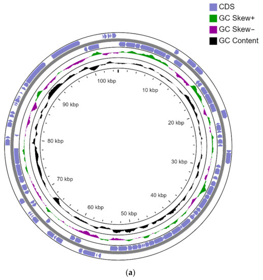 Figure 1. Circle maps of plasmids (a) pCP105 and (b) pCP135. From outside to the center: all CDS and RNA genes on forward strand, all CDS and RNA genes on reverse strand, GC content, and GC skew.