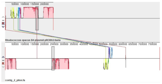 Among the R. opacus plasmids, the pLPS8 plasmid is most closely related to the pROB02 plasmid of the R. opacus B4 strain (Figure 2). However, the pROB02 plasmid is much smaller (245 kb), while pLPS8 is 788 kb.
