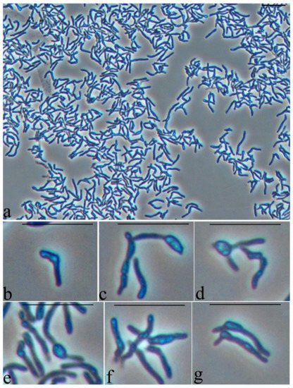 Strain S8 on glucose 1 day of growth. Light microscopy, phase contrast. The length of the scale bar is 10 µm. The cells have the shape of long sticks of uneven thickness, often branching (a,d,g), with characteristic large refractory inclusions (b–g), the size of which often exceeds the thickness of the cells (c,d,e,g).