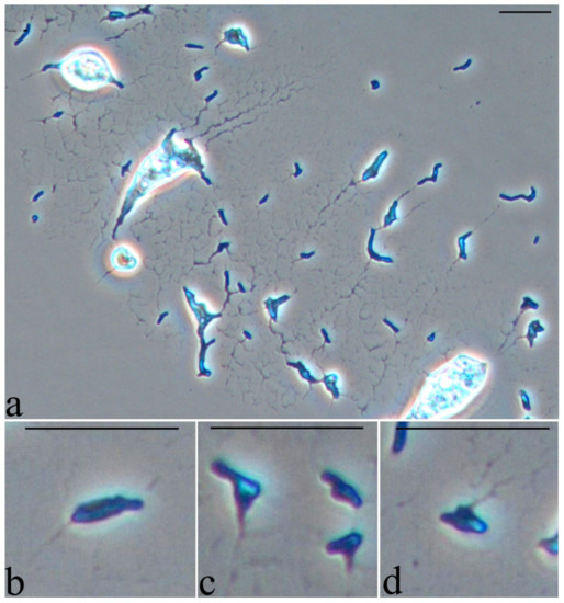 Strain S8 on hexadecane 4 days of growth. Light microscopy, phase contrast. The length of the scale bar is 10 µm. Bacterial cells are “pushed out” from the growth medium on hexadecane during preparation for light microscopy (applying the surface foam material, where the microbial utilization of hexadecane occurs, on a glass slide and pressing the drop with a cover slip) (a). Various forms of some cells with substrate residues on their surface (b–d).