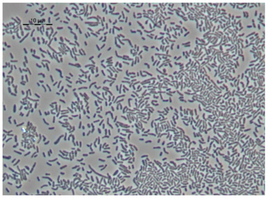 The cells of the R. qinqshengii VT6 strain, when cultivated on a rich medium, have a regular rod-like shape, which is also characteristic of other representatives of this genus. With an increase in cultivation time in a rich medium, the cell morphology does not change, although there is an uneven division of rod-shaped cells or their crushing into smaller cell forms (Figure 9).