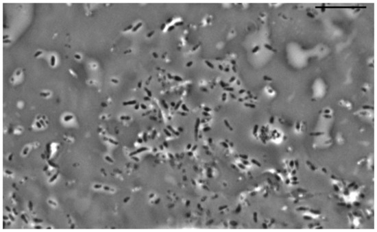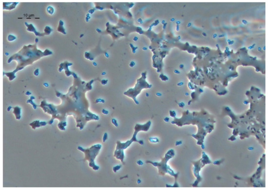 When studying the morphology of cells cultivated in the presence of a hydrophobic substrate, it was found that the cells retain the shape of rods, which indicates active vegetative growth in the presence of a non-toxic substrate. Sorption of the initially hydrophobic substrate (hexadecane) on the cell surface is observed when bacterial cells are “pushed out” from the growth medium on hexadecane during preparation for light microscopy (applying the surface foam material, where the microbial utilization of hexadecane occurs, on a glass slide and pressing the drop with a cover slip) (Figure 7).