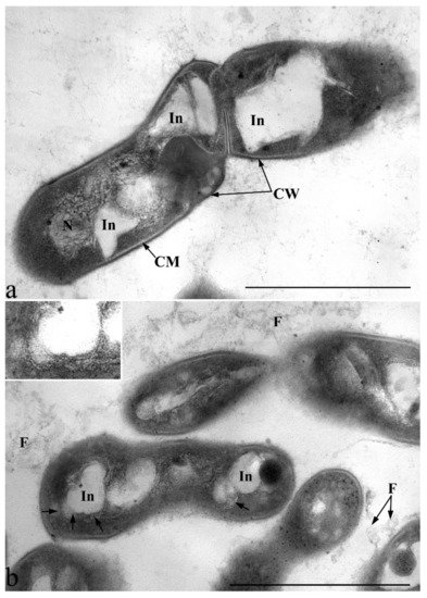Ultrastructural organization of cells of strain S8 during growth on glucose (exponential growth phase) (a) and under growth conditions on dodecane (4 days) (b). Transmission electron microscopy. Ultrathin sections. Designations: N-nucleoid; CM—cytoplasmic membrane; CW—cell wall; In-electron-transparent inclusions; F—fibrillar surface structures. Arrows show membrane-like structures, which are also shown in the enlarged fragment in the inset in (b). Bar—1 µm.