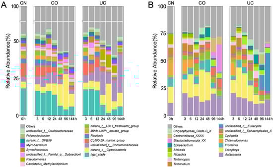 Stacked bar charts of the relative abundance of the prokaryotes (A) and eukaryotes (B) at the genus level. Shown are the averages from n = 3. CN: control group, CO: with lid closed, UC: without lid.