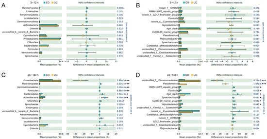 Significant differences of relative abundances of the top 15 prokaryotic phyla (A,C) and genera (B,D) between CO (with lid closed) and UC (without lid) groups. Shown are the averages from n = 3. *: 0.01 < p ≤ 0.05, **: 0.001 < p ≤ 0.01, ***: p ≤ 0.001.