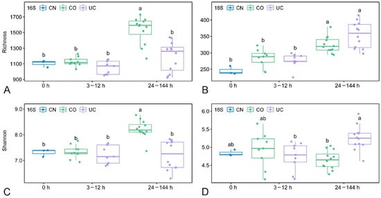 The boxplots showing richness and Shannon index of prokaryotes (A,C) and eukaryotes (B,D) under different storage conditions. Different letters indicate a statistical significance (p < 0.05, ANOVA) between different groups. CN: control group, CO: with lid closed, UC: without lid.