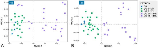 Nonmetric multidimensional scaling (NMDS) ordination exhibited a clear aggregation for samples stored for 12 h or less (Figure 4), which was further confirmed by the dissimilarity tests (ANOSIM, PERMANOVA and MRPP) (Table 1). Meanwhile, an obvious segregation of the microbial communities was observed in samples after 24 h storage. As storage time increased, the microbial communities were clearly separated along the first NMDS axis (Figure 4). Mantel test analysis showed that there were significant positive relationships between the Bray–Curtis dissimilarity of microbial communities and storage time in both CO and UC groups (r ≥ 0.789, p < 0.001, Figure S3). In addition, compared to the control group, the eukaryotic microbial communities varied significantly after 3 h of storage, whereas the prokaryotic microbial communities did not change significantly within 12 h of storage (Figure 4, Table 1).