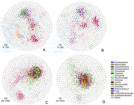 The networks visualizing the OTUs interactions in different groups ((A) 3–12 h in CO group; (B) 3–12 h in UC group; (C) 24–144 h in CO group; (D) 24–144 h in UC group). The nodes are colored according to the phylum classification, and the size of each node represents the node degree. Each node corresponds to an OTU, and the edges between nodes correspond to positive (red) or negative (green) correlations. CO: with lid closed, UC: without lid.