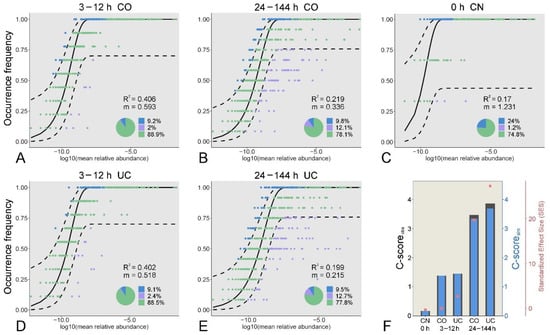 Fit of the occurrence frequency of eukaryotic OTUs as a function of mean relative abundances based on the neutral community model for the microbial communities under different storage conditions (A–E). The solid black line indicates the best fit to the model, and the dashed black line represents 95% confidence intervals around the model prediction. OTUs that occur within prediction are shown in green, and OTUs that occur more or less frequently than predicted are shown in blue and purple, respectively. R2 indicates the fit to the model, and m indicates the immigration rate. C-score metric based on null models (F). The values of observed C-score (C-scoreobs) > simulated C-score (C-scoresim) indicate non-random co-occurrence patterns. Standardized effect size (SES) > 2 and <−2 represent significant segregation and aggregation, respectively. CN: control group, CO: with lid closed, UC: without lid.