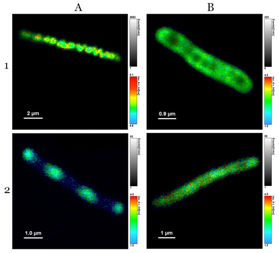 - Bhattacharjee, A.; Datta, R.; Gratton, E.; Hochbaum, A.I. Metabolic fingerprinting of bacteria by fluorescence lifetime imaging microscopy. Sci. Rep. 2017, 7, 3743. [Google Scholar] [CrossRef]