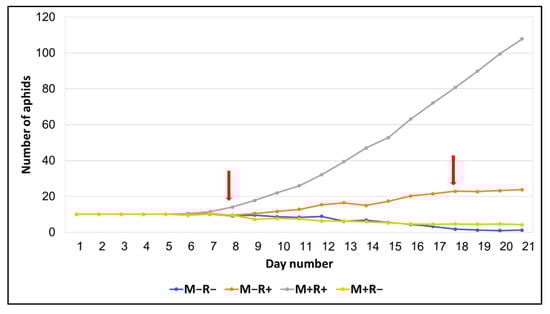 Aphid colony growth over three weeks as a function of inoculant treatment (control (M−R−); mycorrhizae and rhizobium (M+R+); mycorrhizae alone (M+R−); rhizobium alone (M−R+)). The arrows indicate the days at which the aphid populations were first divergent.