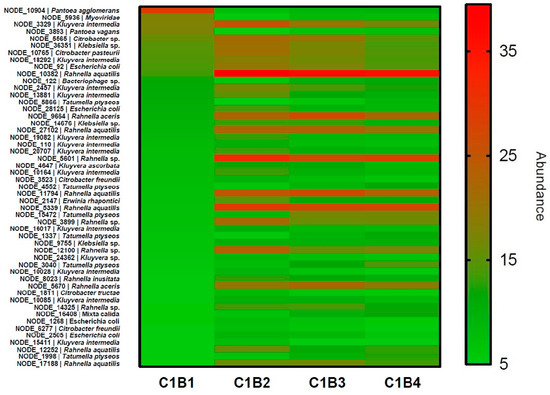 A heatmap representation was used to visualise the dynamics of the temperate phage contigs inside bacterial metagenomes during the first month of the fermentation process for producer B (Figure 1). No heatmap could be made for producer P because the abundance was too small (RPKM max = 11.4 and 1593 values under an RPKM of 5.0 almost all equal to 0). Overall, the abundance of prophages in producer B samples tended to increase for some hosts, while other prophages fluctuated or decreased. For example, the occurrence of contig NODE_10382, affiliated to the Rahnella aqualitis species, increased overtime (RPKM of 13.6, 39.5, 36.4 and 35.6 in C1B1, C1B2, C1B3 and C1B4, respectively) (Table S3). Contig NODE_10904, affiliated to Pantoea agglomerans, decreased after C1B1 (RPKM moving from 29.2 to 7.7, 9.0 and 9.7 in C1B1, C1B2, C1B3 and C1B4, respectively) and contig NODE_3329, associated to Kluyvera intermedia, varied over time (RPKM passing from 17.9 to 25.9, 20.1 and 17.1 in C1B1, C1B2, C1B3 and C1B4, respectively) (Table S3). As expected, these observations of prophage occurrence altogether followed the same patterns as the levels of abundance of the bacterial genera to which they were associated. For example, the genus Rahnella increased overtime (total abundance of 4%, 14%, 12% and 11% in C1B1, C1B2, C1B3 and C1B4, respectively), the genus Pantoea decreased overtime (total abundance of 15%, 4%, 5% and 5% in C1B1, C1B2, C1B3 and C1B4, respectively), and the genus Kluyvera varied overtime (total abundance of 7%, 11%, 10% and 8% in C1B1, C1B2, C1B3 and C1B4, respectively) (data not shown).