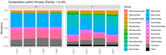 Virus taxonomic assignations at the family level during cider fermentation process for two producers (B: industrial and P: hand-crafted). C1 and C2 indicate the tank ID, and B1, B2, B3, B4, P1, P2, P3 and P4 are the sampling points during the fermentation process, in reference to Table 1.