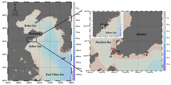 In this study, we chose three stations (XG, ZQ and MD) in coastal Qingdao areas to study the variations in marine bacterial and archaeal communities during an U. prolifera green tide (Figure 1). Among three sampling stations, XG (36.07° E, 120.30° N) was less likely impacted by the green tide, whereas ZQ (36.06° E, 120.31° N) and MD (36.05° E, 120.42° N) were greatly influenced by the green tide. Twenty liters of surface seawater at each station was collected from 13 June to 5 September 2019 (Table 1). After collection, the seawater was filtered through an 800-mesh plankton net to remove large zooplankton, then filtered through a 0.22 μm pore-size polycarbonate membrane. The obtained filters were immediately frozen in liquid nitrogen and stored at −80 °C until further molecular analysis.