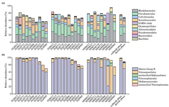 Thirty bacterial phyla and five archaeal phyla were observed during the green tide. Here, the bacterial and archaeal community composition was analyzed at the order level. Rhodobacterales (with a relative abundance ranging from 8.07–77.47%) and Flavobacteriales (4.93–32.76%) dominated the bacterial community across all samples (Figure 2a). The relative abundance of Flavobacteriales was significantly greater during the outbreak phase compared with the decline phase (p < 0.05). Rhodobacterales exhibited greater abundance during the decline phase, but not to an obvious extent (p > 0.05). Cellvibrionales (0.55–9.96%), Synechococcales (0.08–48.33%), SAR86 clade (0.01–13.11%), Oceanospirillales (0.39–13.72%), Alteromonadales (0.27–20.81%), Pseudomonadales (0.01–20.04%), Bacteroidales (0.04–29.39%) and Bacillales (0.00–12.84%) also occupied greater proportions in the bacterial community during the green tide. Cellvibrionales (p > 0.05), Synechococcales (p > 0.05), Alteromonadales (p < 0.05), Pseudomonadales (p > 0.05) and Bacillales (p > 0.05) were more abundant during the outbreak phase; in contrast, SAR86 clade (p > 0.05), Oceanospirillales (p > 0.05) and Bacteroidales (p > 0.05) exhibited greater abundance during the decline phase.