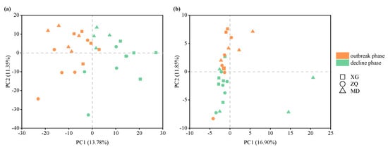 Principal component analysis (PCA) of bacterial (a) and archaeal (b) communities at the OTU level during the green tide.