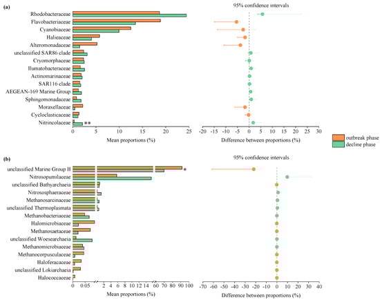 Wilcoxon rank-sum test of the top 15 bacterial (a) and archaeal (b) taxa at the family level during the green tide. * p < 0.05, ** p < 0.01.