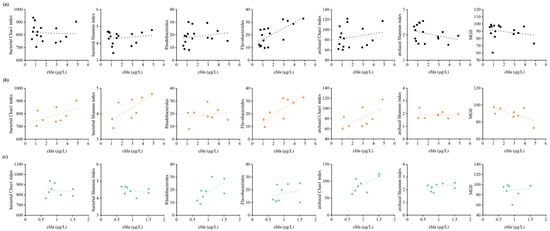 Correlations of Chao1 index, Shannon index, relative abundance of dominant taxa with chla content during the green tide (a), the outbreak (b) and decline (c) phase.