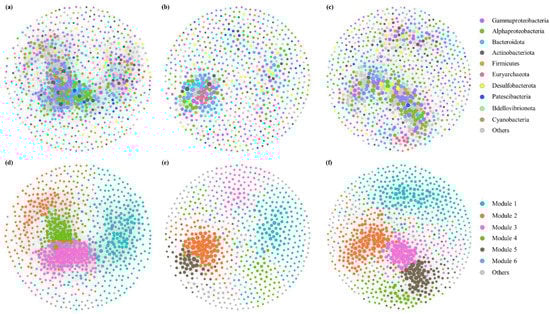 Co-occurrence network colored by taxonomy during the green tide (a), the outbreak (b) and decline phase (c), and colored by modularity during the green tide (d), the outbreak (e) and decline phase (f).