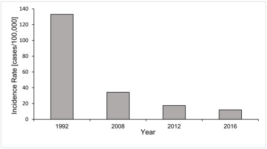 Annual candidemia incidence rates in infants aged ≤1 year described from surveillance at a metropolitan site in Georgia in 1992, 2008, 2012 and 2016 [6,44,46]. Candidemia incidence in this age demographic shows a declining trend, with incidence decreasing markedly from 133.0 to 12.0 cases per 100,000 population in 1992 and 2016, respectively.