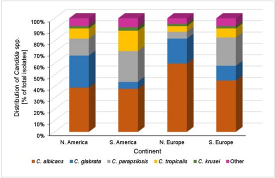 Here, an assessment of Candida spp. distribution and antifungal susceptibility will focus on spatial and temporal data shifts at the continental level. Additionally, specific consideration will be given to the role of patient pre-disposing risk factors in species distribution as well as the interaction between increased use of antifungals and shifts towards strains with less susceptibility [72].
