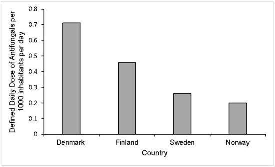 Defined daily dosage (DDD) of antifungal drugs for systemic use per 1000 inhabitants per day in 2011 in healthcare settings across Denmark, Finland, Sweden and Norway. The total use of systemic antifungal drugs is significantly higher across healthcare settings in Denmark than Norway, Sweden and Finland. In Denmark, the DDD per 1000 inhabitants per day was approximately 0.712 compared to 0.459, 0.26 and 0.2 for Finland, Sweden and Norway, respectively [54].